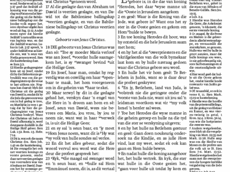 Op de liturgische tafel van de Afrikaanse protestantse kerk in Pretoria ligt een oude Nederlandse Statenbijbel met kanttekeningen. Ernaast een kersverse uitgave van een Nieuwe Testament met kanttekeningen in het Afrikaans. De uitgave is dinsdag gepresenteerd.