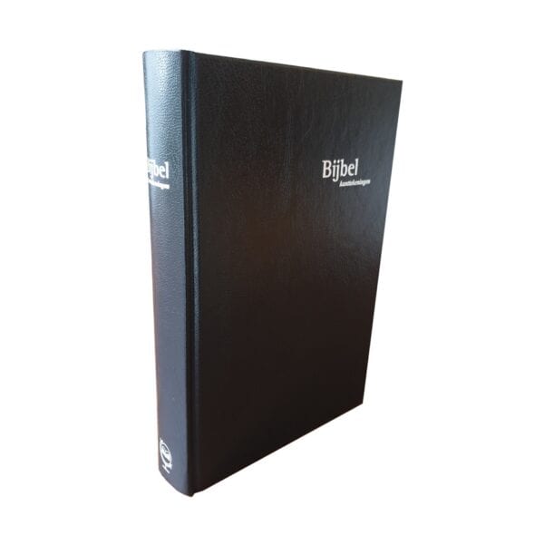 Verspreideditie kanttekeningenbijbel, 14,6 x 21,5 cm. Zwart kunstleer, witsnee, met harde kaft.