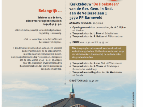 De GBS hoopt op D.V. 11 oktober haar 59e toogdag te houden in het kerkgebouw van de Gereformeerde Gemeente in Nederland te Barneveld.